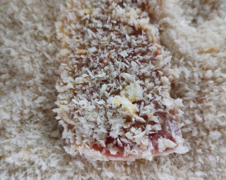 - Anschließend das Fleisch zuerst in Mehl (wir nehmen Tempuramehl) dann im Ei eintauchen und zuletzt in Panko wälzen und dabei Panade leicht andrücken